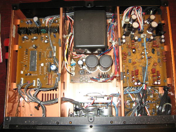 テープを入れPLAYを押すと一瞬動き直ぐ停止 キャプスタンは動くがテープが巻き取られないのでカバーを開きメカを取り出す 本体は銅メッキシャーシで電源トランスはシールドカバーに入っており十分すぎる大きさ ブロック別に仕切られさすがに上位機種だけのことはある作り