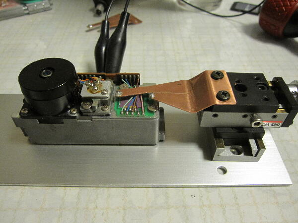 適度に押し当てるバネ力を持たせてXYステージに取り付け XYステージとピックアップをベース板に固定