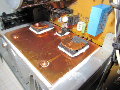 不良のFETを交換 アルミ放熱フィンに銅板を挟み取り付ける様になっていてFETを固定する金具銅製