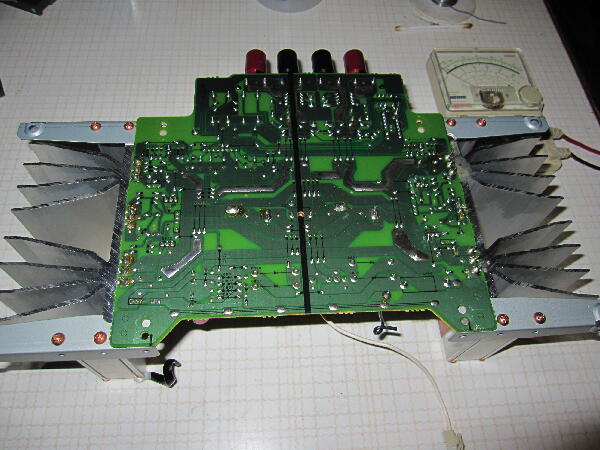 | 抵抗交換でアイドルは正常となりSP接続リレーが程なく動作 DCオフセットは5mV以内で問題ないのでアイドルを調整 Rchは200mA以上でかなり熱くなるのでやや落とし150mAに設定 その後音出ししてみた サンスイの音作りとは違いマイルドな印象がするが繊細さも持ち合わせたように思う |