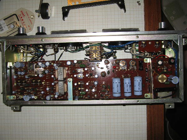 電源を入れるとキャプスタンは回りピンチローラの固着は無く 又リールモータも回り拍子抜け テープを掛けPLAYを押すとレベルメータは振りヘッドフォンから再生音が出て正常動作 このまま使えそうだが各部を見るため掃除を兼ねばらしてみる