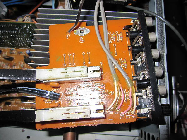信号を追っていくとボリュウムまで信号が来ていない プリアンプ入力に接続されているパターンに直接信号を入れるとSP端子より出力されるのでプリ メイン共正常でセレクトSWの不良?と思い基板を外しSWのハンダを吸い取ろうと準備し何気なく後ろパネルを見ると外部接続の表記があり IN OUTがオープンとなっている