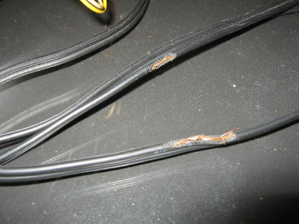 電源ケーブルをよく見ると被覆が削れている ネズミに齧られた様だ サイドウッドの傷も打ち傷ではなく齧られた跡のようだ