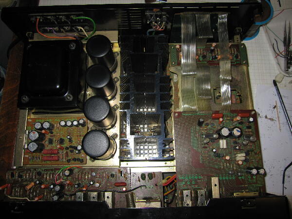 10000μ×4と電源部はしっかり作られている オフセットが左右共100mV程あったので調整 放熱器がかなり熱くなるので少しアイドルを落しておいた