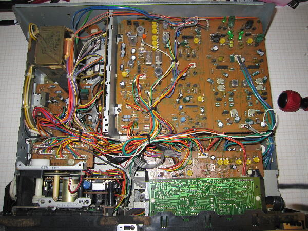 受け入れ時の症状は再生動作は何とかするが暫くするとテープ巻取りが止まりテープが絡む 早送りは出来たり出来なかったり 巻き戻しは出来ない カセットドア開は動作するが開いているドアはカセットを入れるとドア底にある光電センサで感知して自動で閉じるが透明ケースのカセットではセンサが遮光しないのでPLAYを押すと開いていたドアは閉まるはずがベルトの滑りからかいずれも手で補助しないと閉まらない
