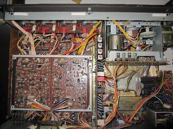 ベルト交換のためメカを外そうとするが上の基板を外さないと下基板に接続しているメカからの配線コネクタが抜けない