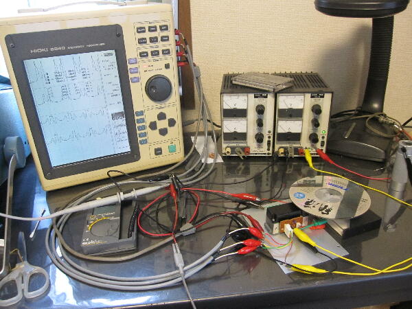 正常に動作している701ESのピックアップはフォーカスをファンクションSGで振らせたとき受光センサA,B,C,Dはどの様な応答をするのか測定してみた 4ch同時測定出来るメモハイ8840が役に立つ レーザ出力を0.3mW程度にしてsin波0.5Hzでフォーカスを振らしてみた 予想ではhavsin波の様な波形と思ったが 予想に反してフォーカス:(C+D)-(A+B) トラッキング:(A+C)-(B+D) RF:A+B+C+D に関係あるような波形 CDディスクの位置によっても変化する 光学系が狂ってなければ4波が関連してこの様に出てくると思われる