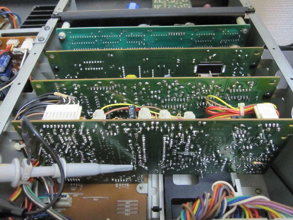 音飛びする時はサーボの乱調が起きる様で一瞬メカから異音がする コンデンサの劣化か?CD-34ではサーボ部のケミコン劣化で音飛びが起こったのでケミコンを外して調べてみた 100μ/10V 4個は60μ程に劣化 之は電源パスコンで容量劣化は余り影響無さそう 他のケミコンは特に問題無さそう バイポーラも問題無さそう ケミコンのせいではないと思うが外したので一応交換しておく
