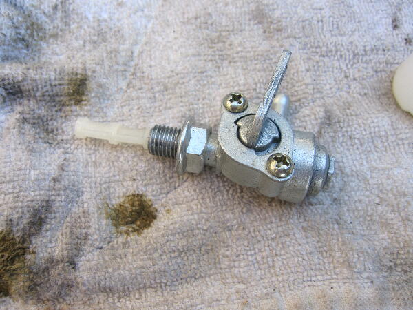 燃料コックを外して分解 キパッキンが劣化しているのでゴムシートで大小2枚重ねのリングを作り代用 漏れは止まった