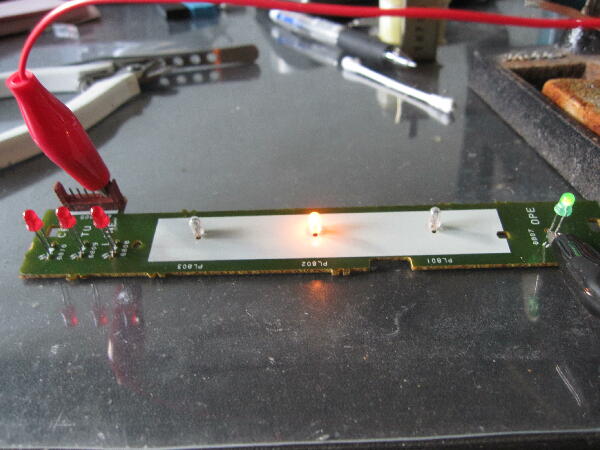 試しに電球色のLEDにして点灯してみると何となくイメージが違うので黄LEDに交換 DC10V程度が印加されている 高さに余裕が無いので抵抗の付け方を考えなくては