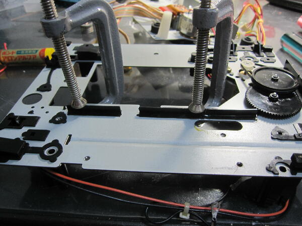 ディスククランプを外して トレーを見てみると ディスクを上下させるレバーが片側外れている これが引っ掛かりトレーが出てこない