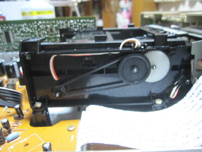 カセットハーフ押さえ用と思われるバネが外れている 樹脂部品に掛かっていた思われるがバネ力が強いので 樹脂のツメが割れて無くなっている