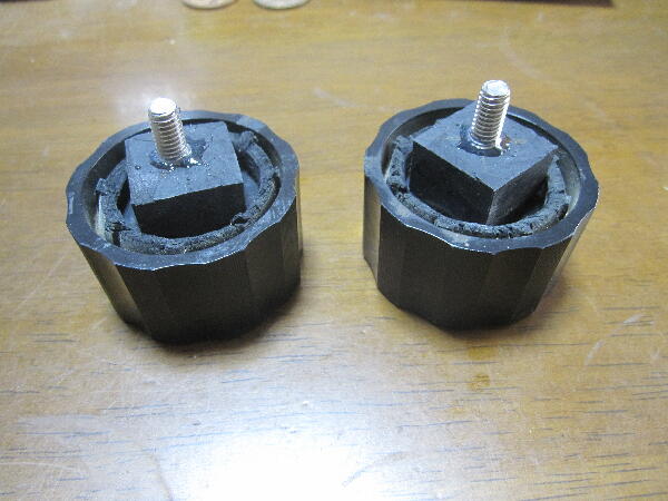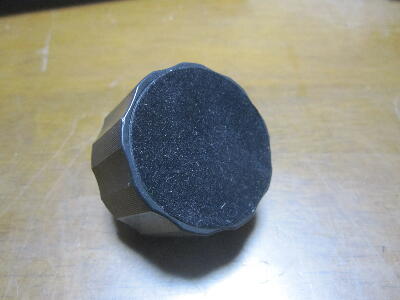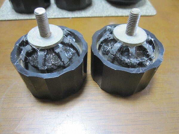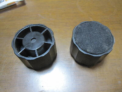 クッション性の良いスポンジ系に適当なものが無く 硬くはなるがサイズ的に合うφ20mmゴム丸棒がないか探してもφ25mmしかなく 20mm角棒が在ったので加工すれば何とか成りそう φ20mmに入る様カッターで角を落とし 樹脂足に嵌めこむ センターにM 6 ネジを埋め込んで何とか形になった