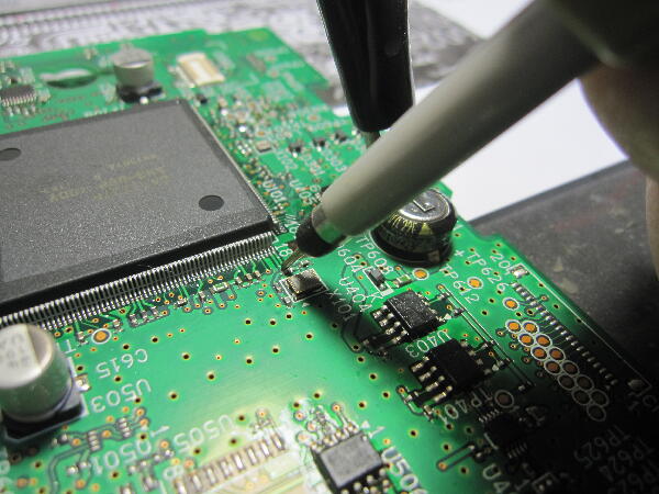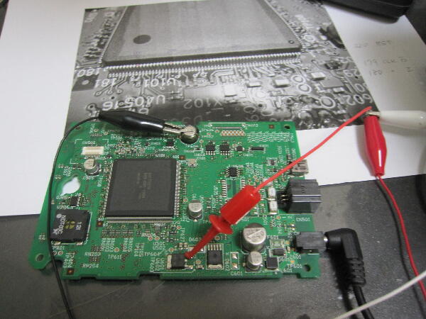 基板のCPUのリード拡大写真を取り印刷して ピンを追える様にする (実物はピッチが細かすぎて追えない)