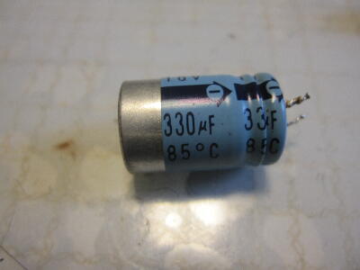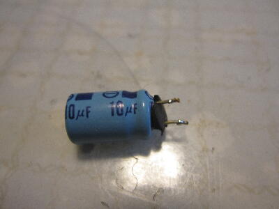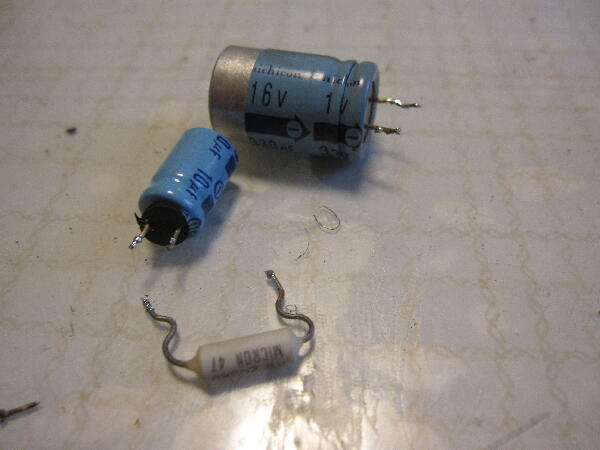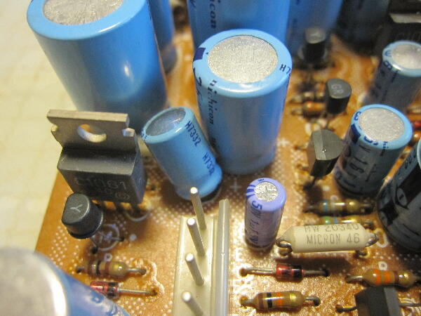 良く見るとパンクしてゴムが出ている 10μ/35Vを交換 他にもTO-220Trの隣のケミコン 330μ/16Vは熱で頭が出ている