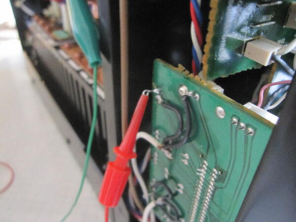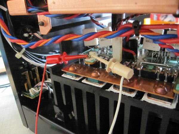 基板上のTP1 TP2 を当たるのは部品に囲まれ無理なので 別のポイントにするが 摘み難いのでメッキ線をハンダ付けして当たり易くする