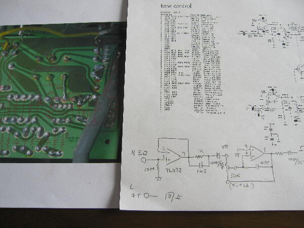 トーンコントロール基板がマニュアルの基板と異なる 基板番号M12512-8 となっているが 実物は12784-2 となっておりオペアンプの使用数が多くなっている TL071 4個が TL072 が5個となって 実質倍以上になっている