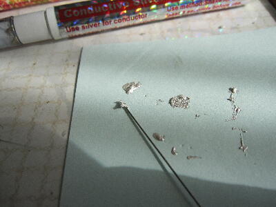 コンダクトペンの銀塗料を細いピアノ線に着けて 隙間から抵抗体と足が繋がる様塗ってみる